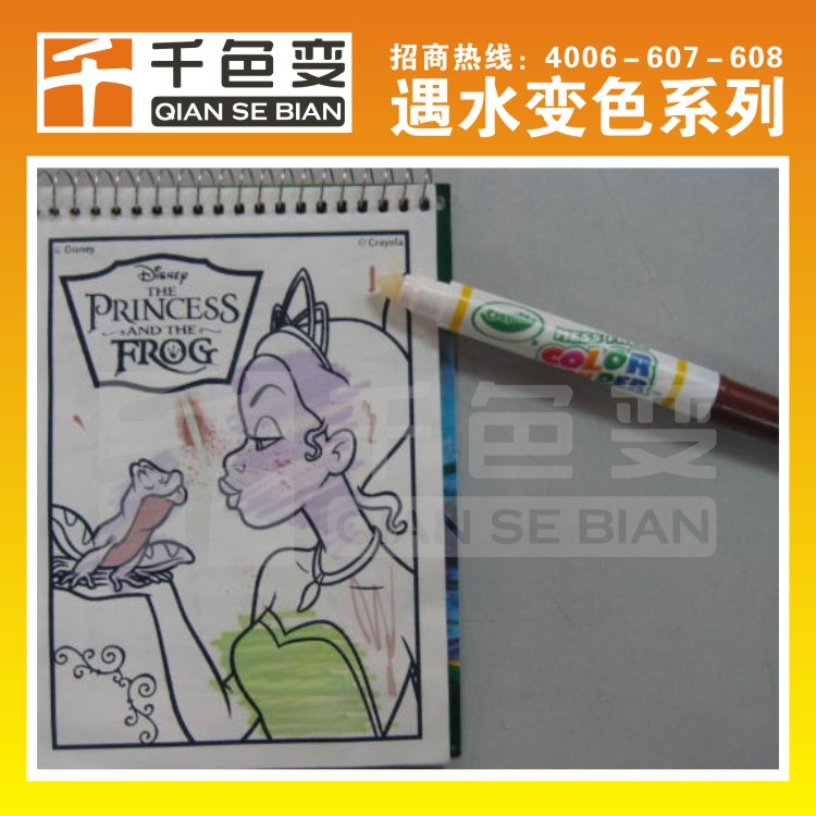 遇水变透明油墨是水性丝印墨本身呈白色,遇水后变透明,干后还原。由于遇水变透明油墨不含有害物料,已获得EN71-3检测,是一种安全之水性丝印变色墨,适宜印制各式玩具,奇妙画布,不干胶贴纸,啤酒杯垫,雨伞或有趣味玩意。